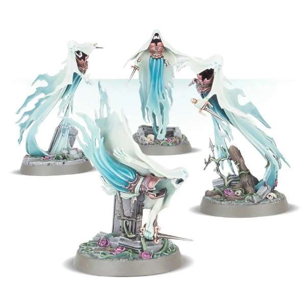 Myrmourn Banshees to przerażające duchy Nighthaunt, które żywią się czystą magią. Każde zaklęcie wroga przyciąga je niczym padlina drapieżniki, a ich gniew wobec świata żywych sprawia, że każdy śmiertelnik, który znajdzie się na ich drodze, może zostać natychmiast zabity przez zimne, przeklęte sztylety. Te eteryczne stworzenia dryfują nad ziemią, emitując złowieszcze krzyki i emanację desperacji, tworząc scenę pełną grozy i napięcia. Zestaw został zaprojektowany tak, aby był prosty w montażu dla nowych hobbystów, jednocześnie zachowując wysoki poziom detali, który docenią doświadczeni modelarze. Modele składają się z części montowanych na wcisk, bez konieczności używania kleju, co znacznie ułatwia budowę i skraca czas przygotowania armii do gry. Każda Myrmourn Banshee ma charakterystyczne, rozwiane całuny odsłaniające czaszkę, a krzyczące grymasy dodają dramatyzmu figurkom. Modele są częściowo puste w środku, co nadaje im lekkości i wrażenia unoszenia się w powietrzu. Zawartość zestawu